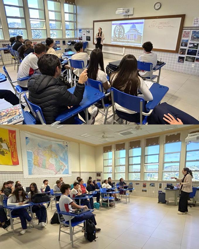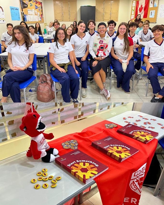 Camila Agurto visitou a unidade de Belo Horizonte e compartilhou sua trajetória como estudante internacional do Peru. Durante a visita, destacou áreas de excelência da University of Calgary, como saúde infantil, computação quântica e sustentabilidade da água, mostrando aos alunos oportunidades de estudo e pesquisa em nível internacional.