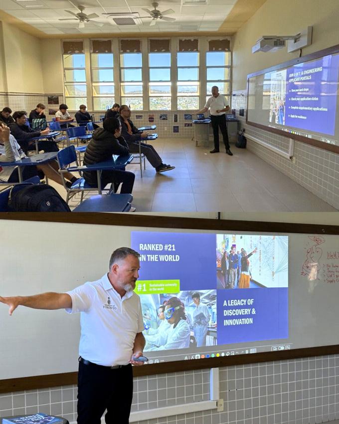 Micah Schieven, ex-aluno e recrutador da University of Toronto, esteve nas unidades de Belo Horizonte e Nova Lima. Ele apresentou os três campi da U of T, explicou sobre bolsas de estudo e financiamento e ressaltou que a universidade está entre as 20 melhores do mundo, sendo referência em ciência de dados, inteligência artificial e ciências da saúde.